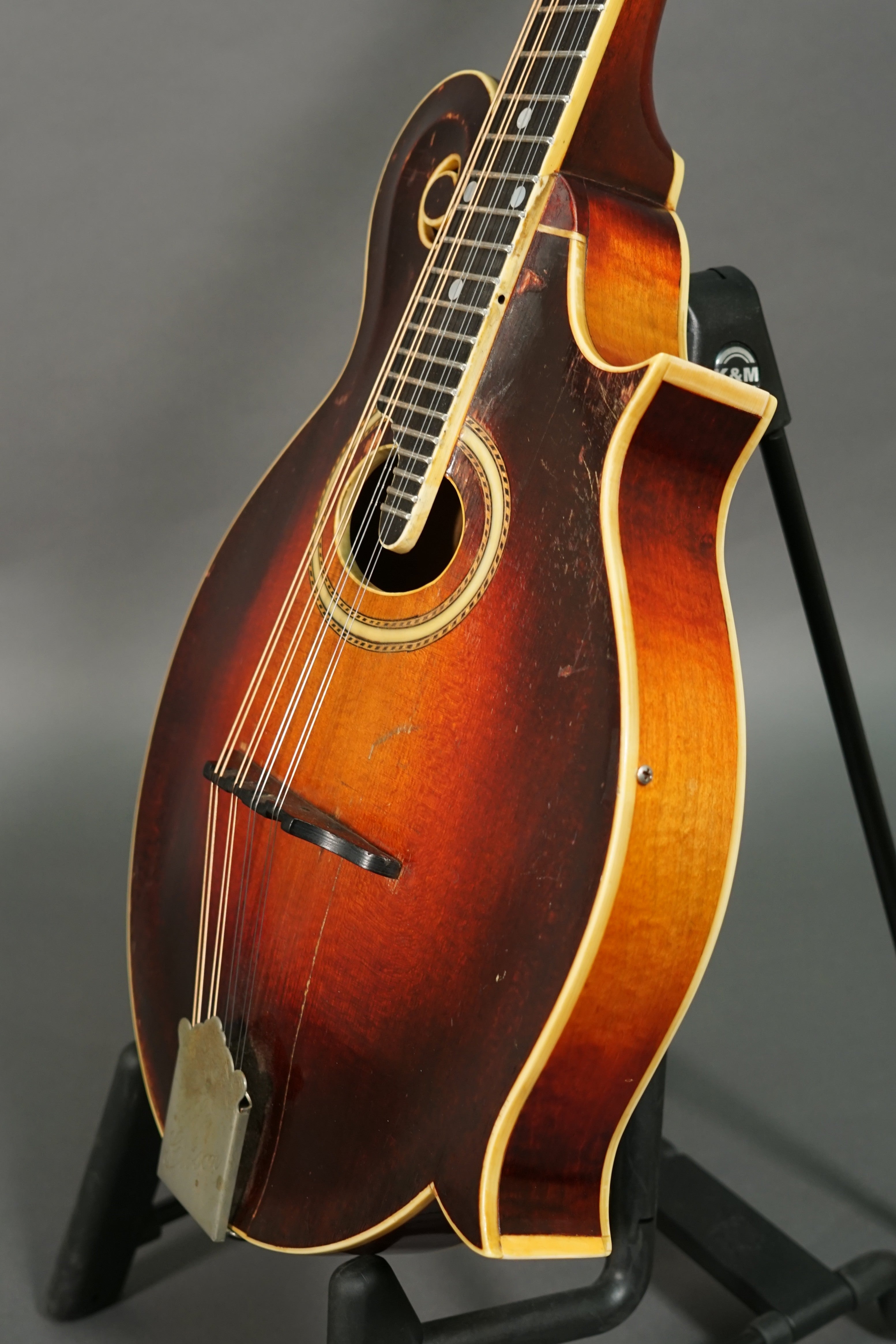 A lovely F-style oval hole mandolin from the Lloyd Loar era — the golden age of Gibson's mandolin production — featuring some stunning figured maple. This mandolin has had an expert headstock repair, purportedly done at the Gibson factory, and two crack repairs. The mahogany neck has the comfortable chunky v-profile common to the era of Gibson mandolins, and it plays great all the way up the board. Sound is phenomenal — rich and woody with plenty of low end and nice sustain. The pickguard is issing, tuners are replacements, and the bridge appears to be period-correct; the tailpiece is original.