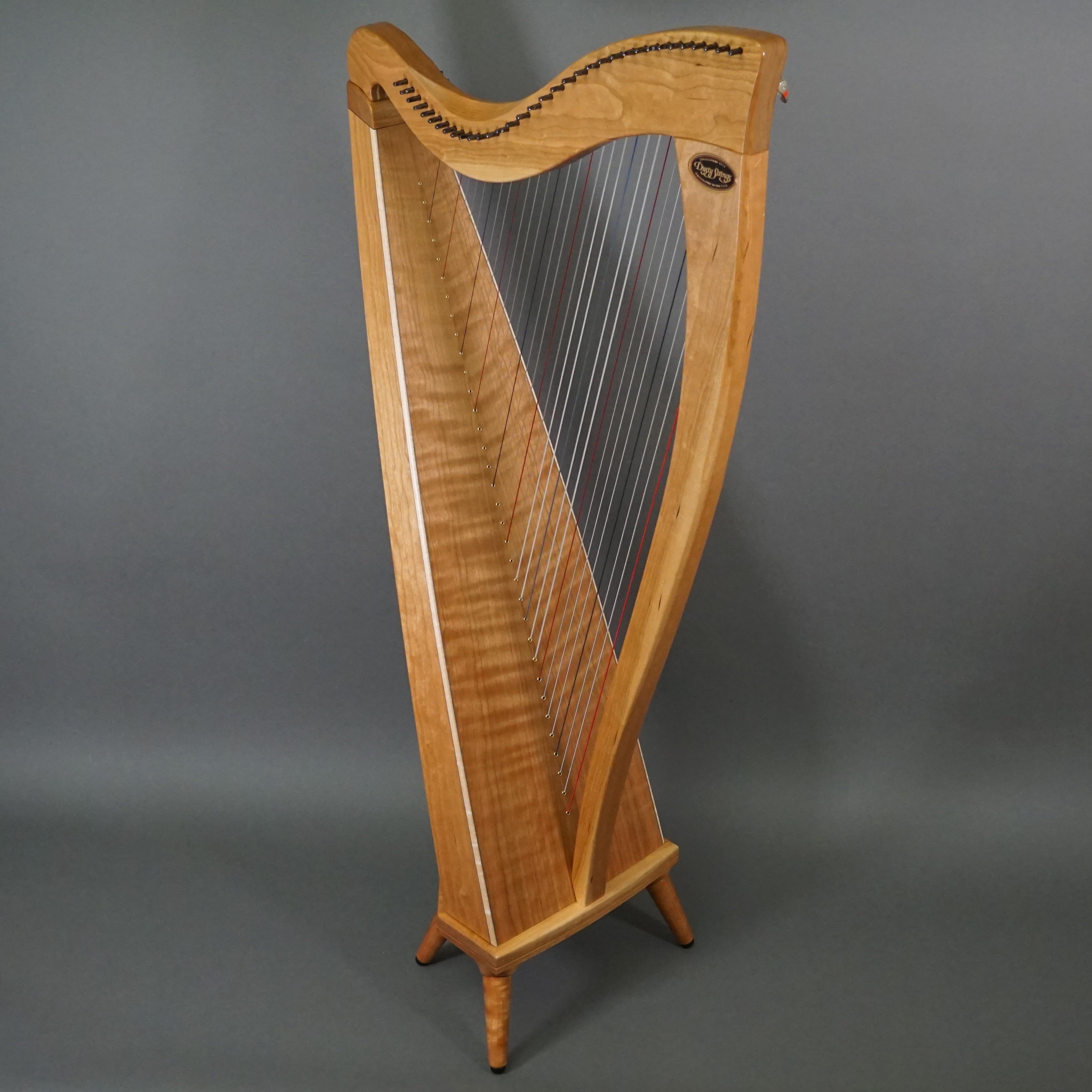 34 string, full Camac levers, solid figured cherry construction, mahogany and spruce soundboard with cherry veneer, removable base, includes case. Light weight 34 string model. Photos are representational; actual wood appearance can vary from harp to harp.