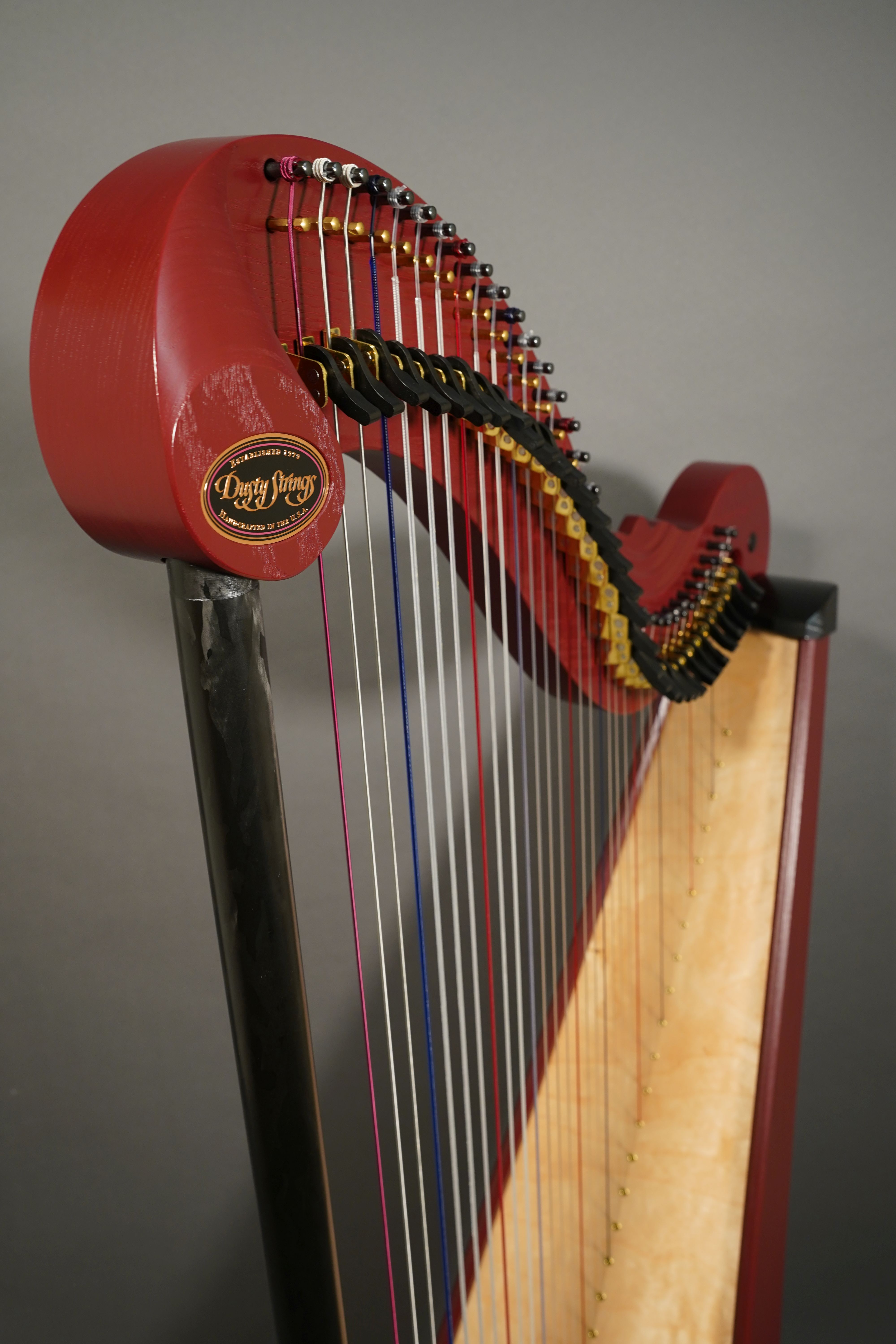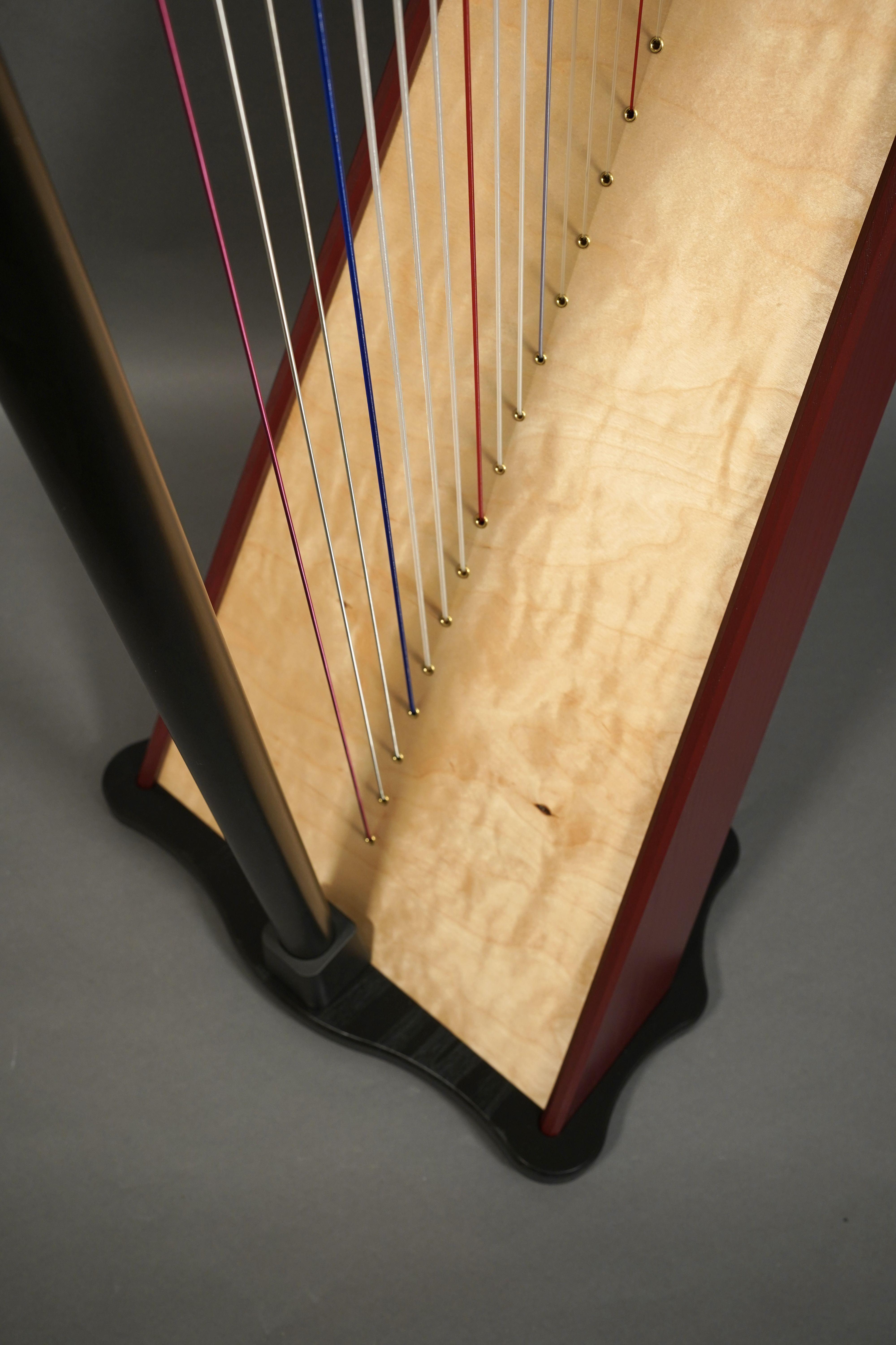 Designed in the mariachi harp tradition, 34 strings, full Loveland levers, solid ash neck and pillar, European birch laminate stave back body design, birch neck, carbon fiber pillar, Dusty Strings harp pickup installed, includes case and extendable legs.