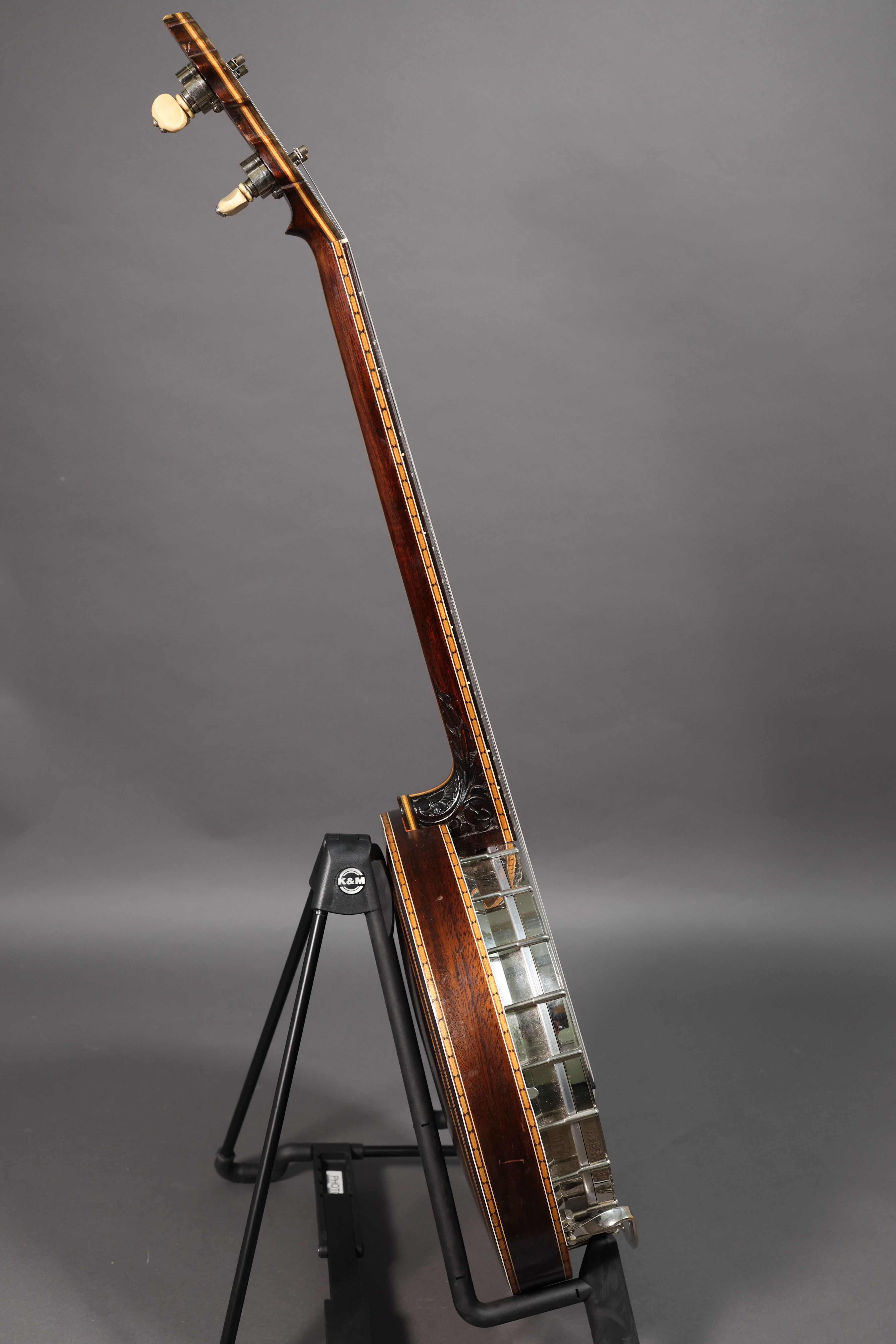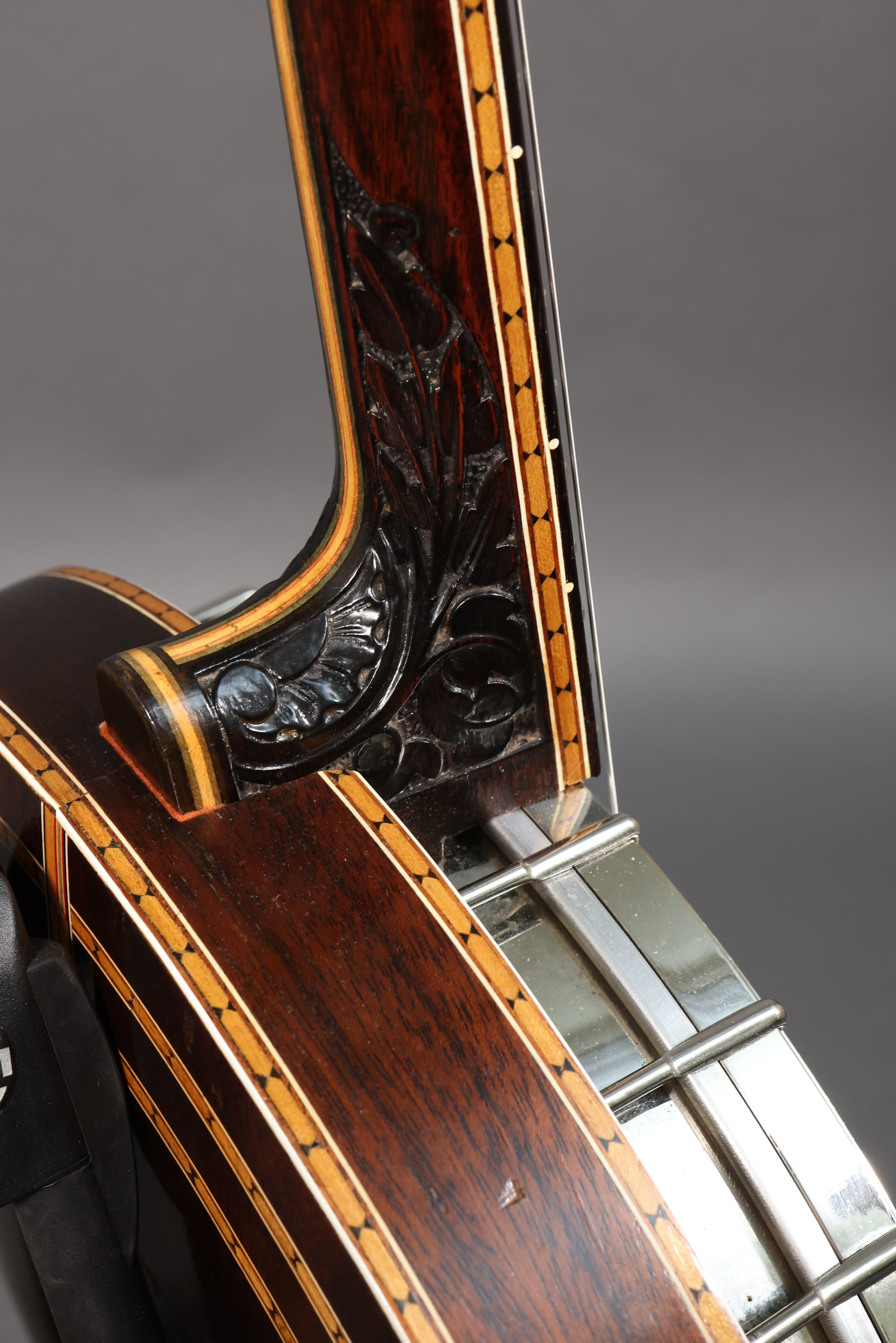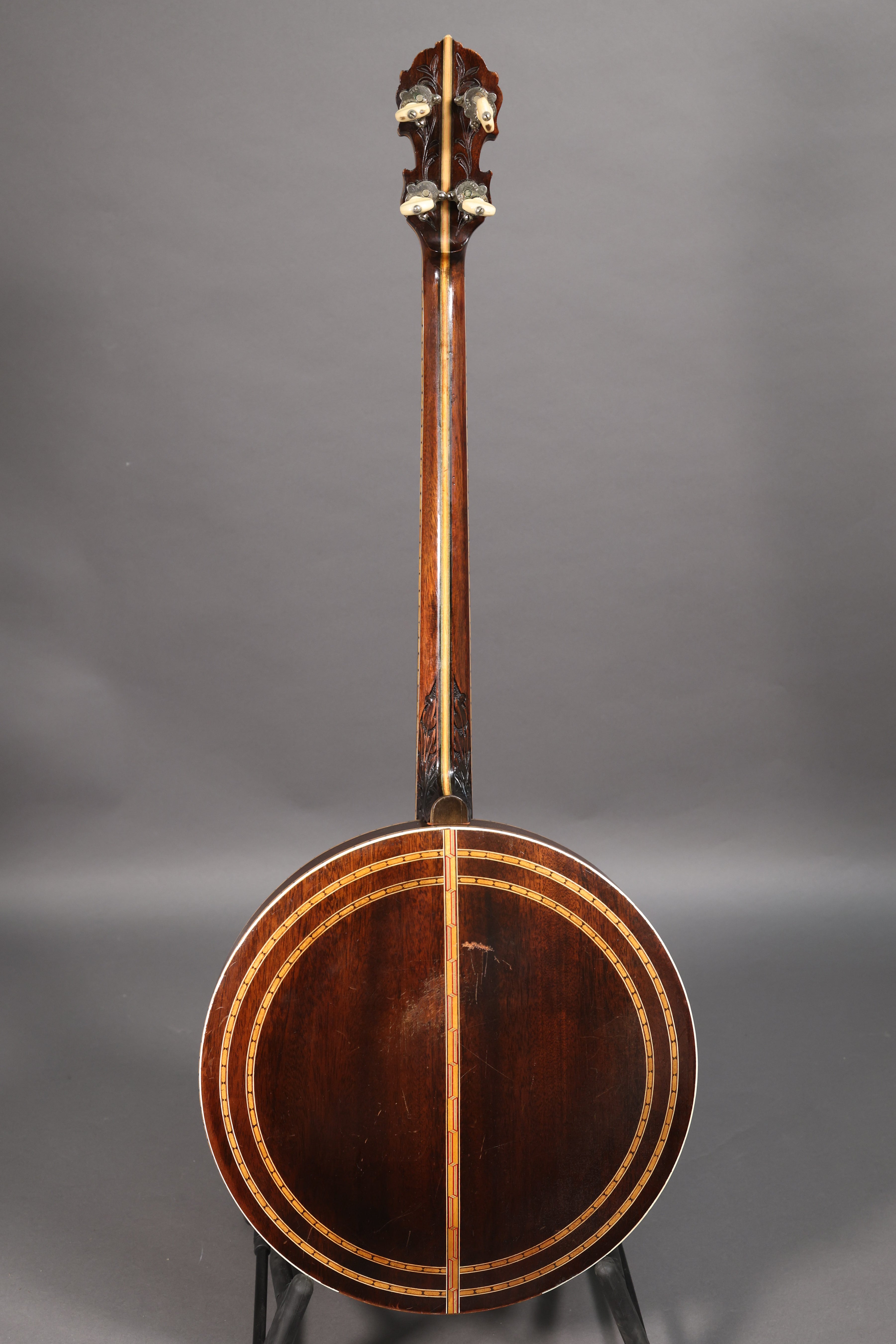 c. 1922 Paramount Style C tenor banjo in excellent condition including its original hard shell case. A well-preserved example of a fine tenor banjo from a peak period of American banjo manufacturing, featuring its original finish and what appears to be its original hardware. This is a superb sounding archtop tenor with great projection and a pleasant resonance, and it holds its tune perfectly thanks to its excellent set of geared Page tuning machines. Premium cosmetic features include mother of pearl dove fretboard inlays, lozenge wood marquetry, and ornate floral carving on the heel and back of the headstock. The laminate mahogany neck has a gentle curved V profile and the angle is spot-on, with action measuring 6/64" and 4/64" from the 12th fret to the bottom of the low and high string, respectively, with optimal break angle over the bridge. Currently setup in Irish tuning (G-D-A-E), but easily convertible to C tuning with the appropriate set of strings.