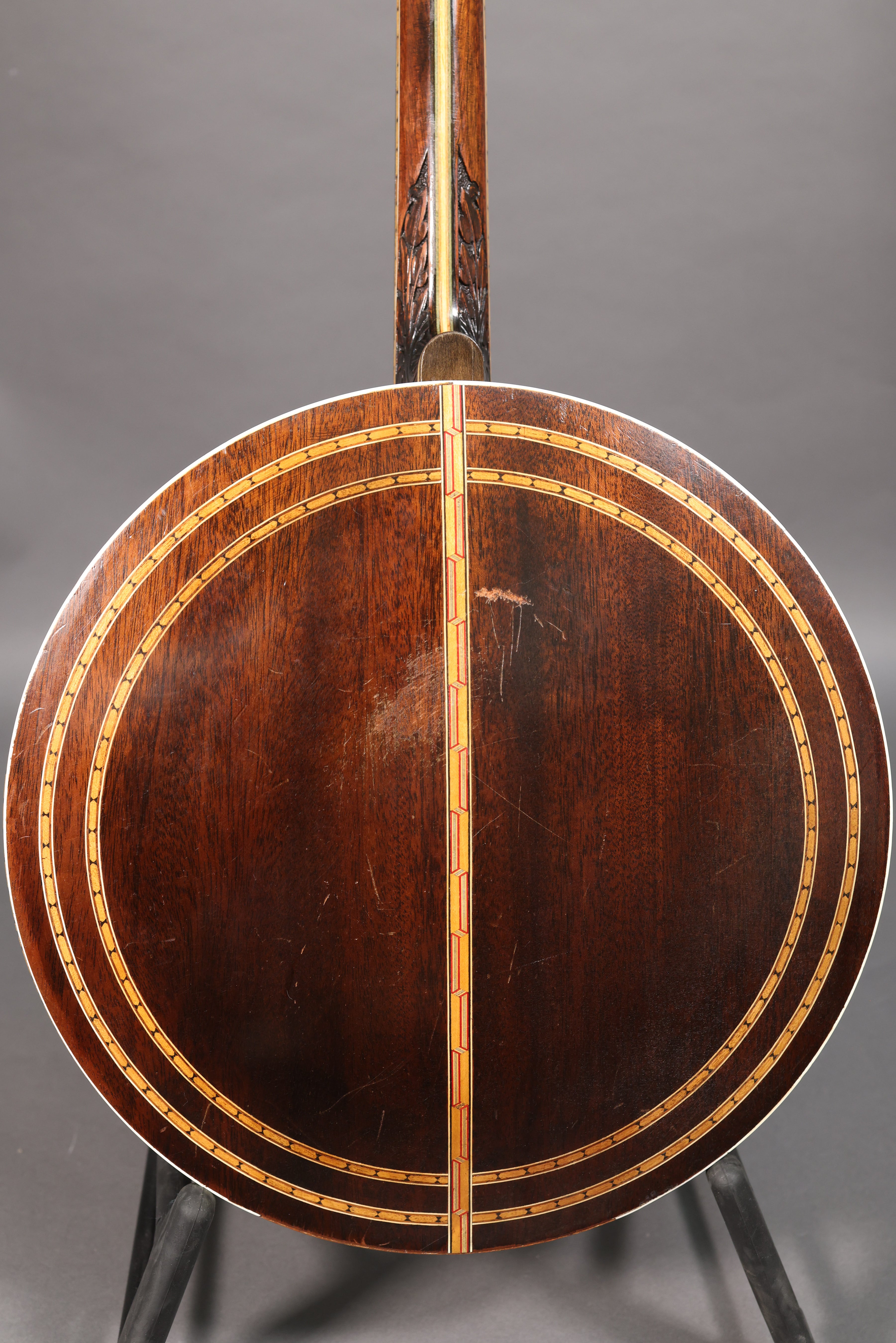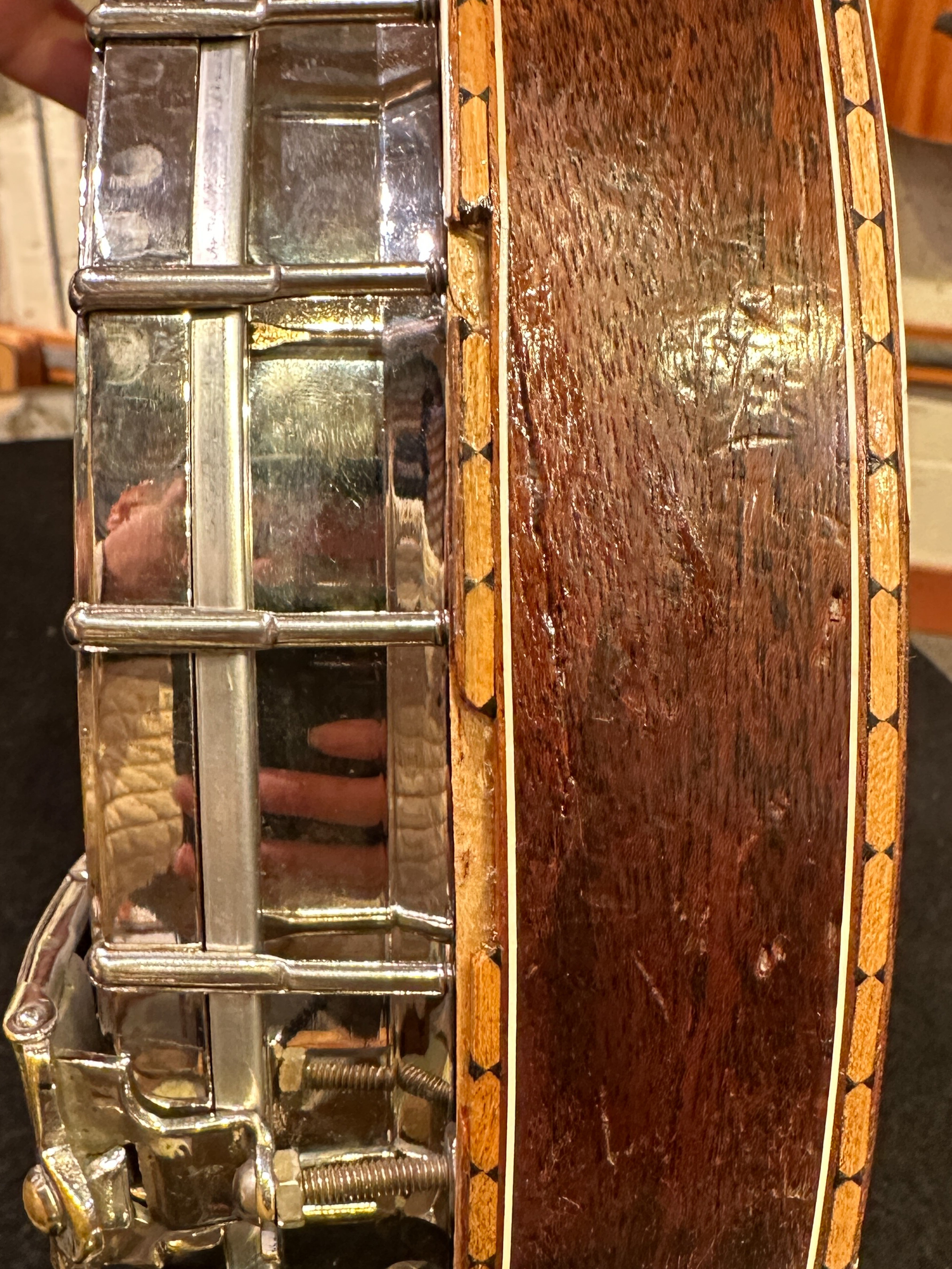 Cosmetic wear includes general scratching, worming, and rubbing in the finish throughout, particularly on the back of the resonator in the belt buckle zone. A section of marquetry and binding is missing near what appears to be a minor impact crack in the bottom of the resonator. The crack has long been repaired and is in fully stable condition. This banjo was refretted at some point with modern gauge fretwire; frets are level and show only very minimal signs of use.