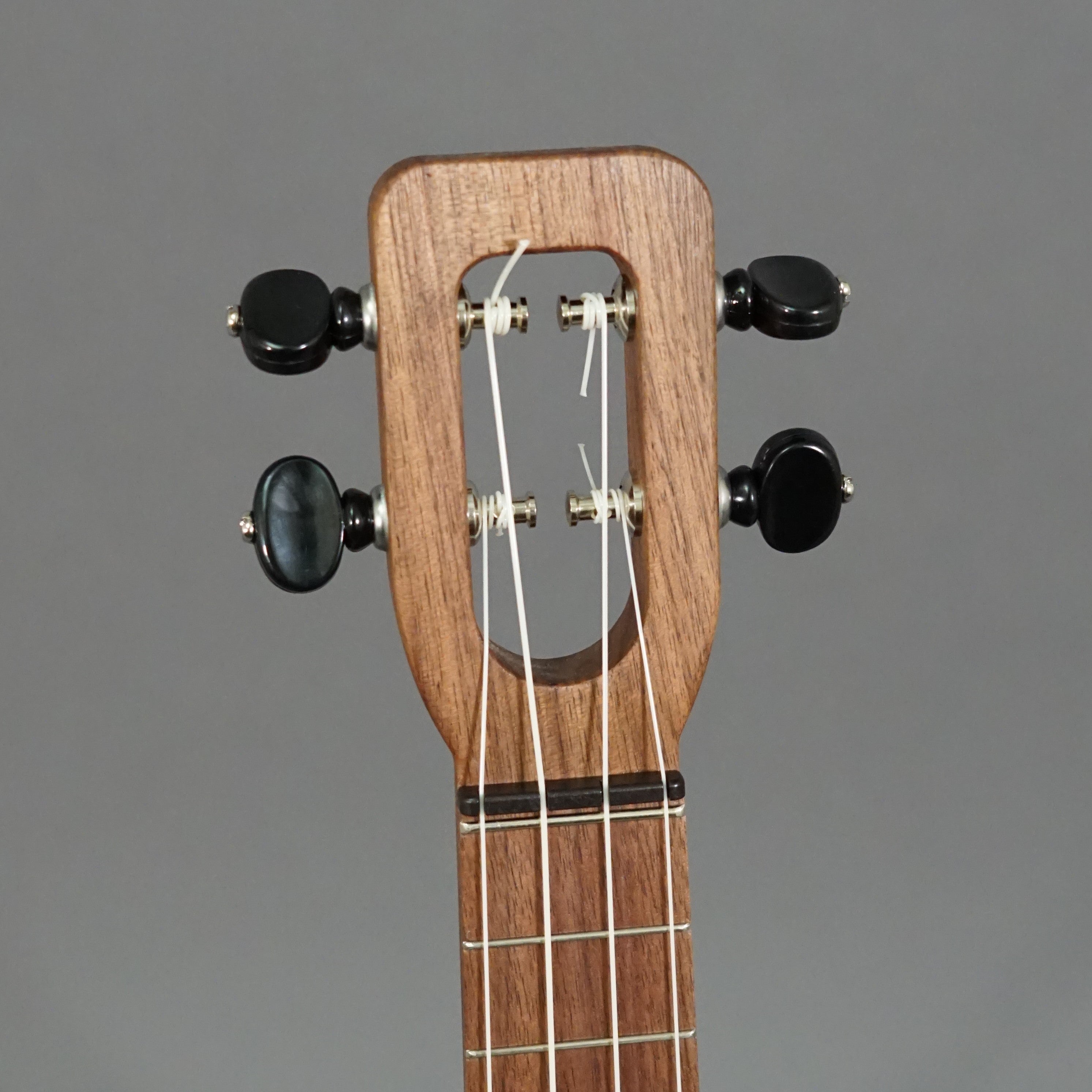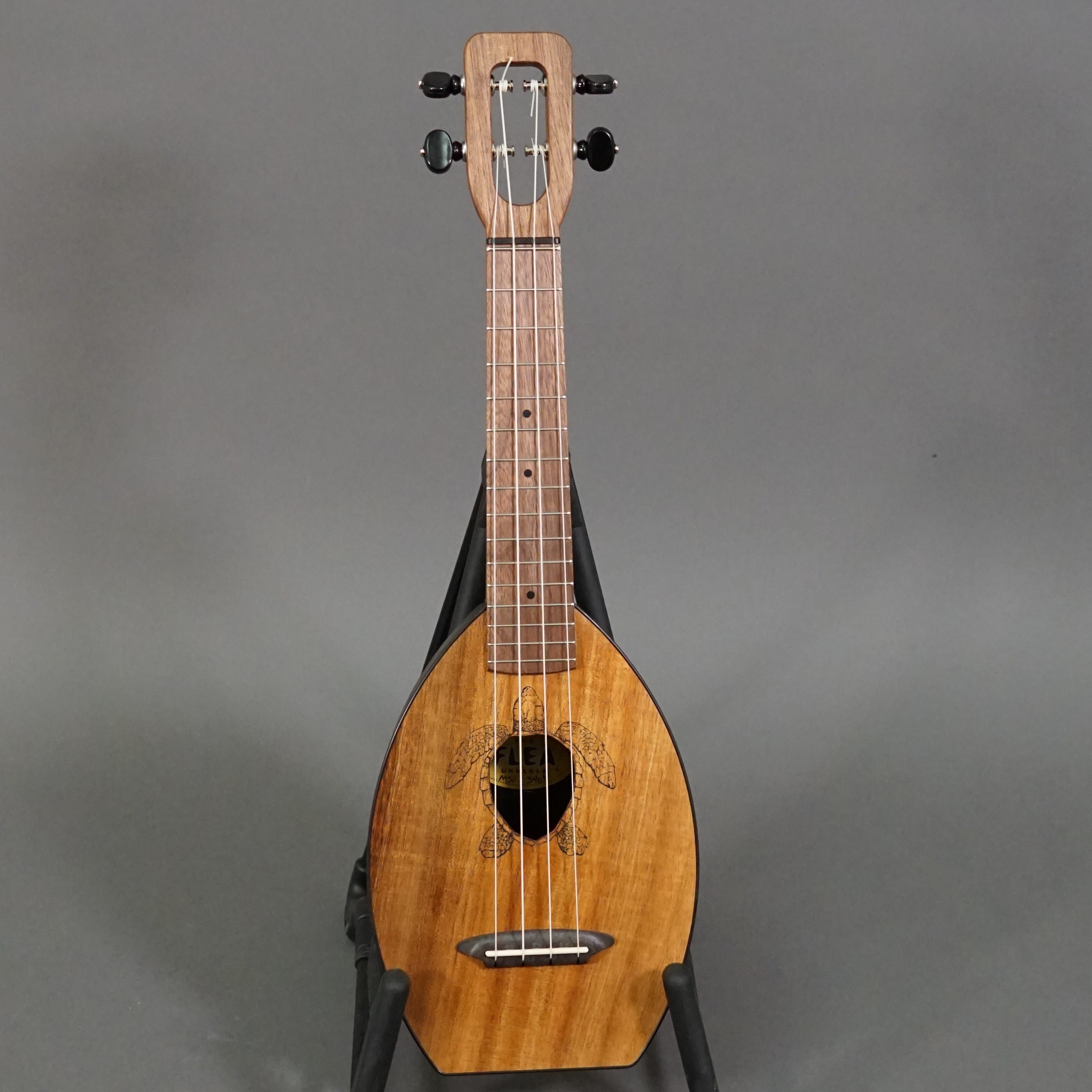 Soprano, solid koa top, molded thermoplastic back and sides, wooden fingerboard with metal frets, laser-etched turtle rosette, includes gig bag.