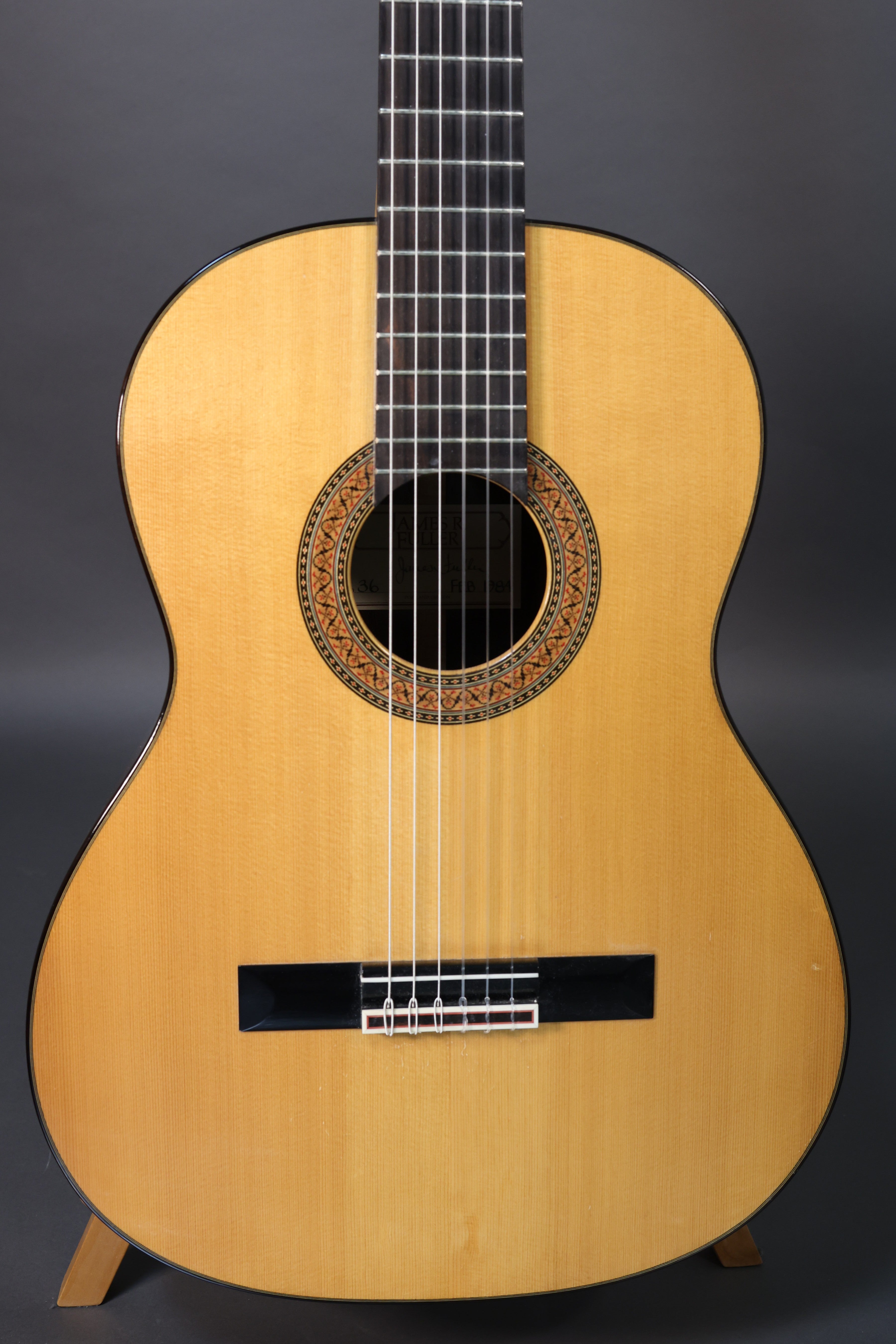 Used James R. Fuller classical guitar handmade in Portland Oregon in 1984 featuring a spruce top and Brazilian rosewood back and sides, in excellent condition and including a hardshell case. Information about Fuller is scant, but it's clear from holding and playing this instrument that he was a serious luthier with access to top-notch techniques and materials. The spruce top is remarkably straight grained and features five fan braces and two short wing braces on each side of the lower bout, and the Brazillian rosewood back is symmetrically bookmatched and shows some attractive spider-webbing. All interior joinery is super clean and expertly assembled. Setup with action measuring 3.5mm from the 12th fret to the bottom of the outside strings with a hint of relief in the neck. This guitar sounds sweet and clear with even string-to-string balance and accurate intonation. There is very little wear to be found in the fine lacquer finish and the frets are unworn.